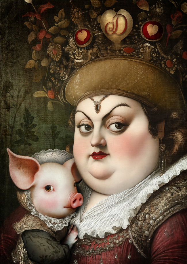 The Duchess was sitting on a three-legged stool in the middle, nursing a baby....