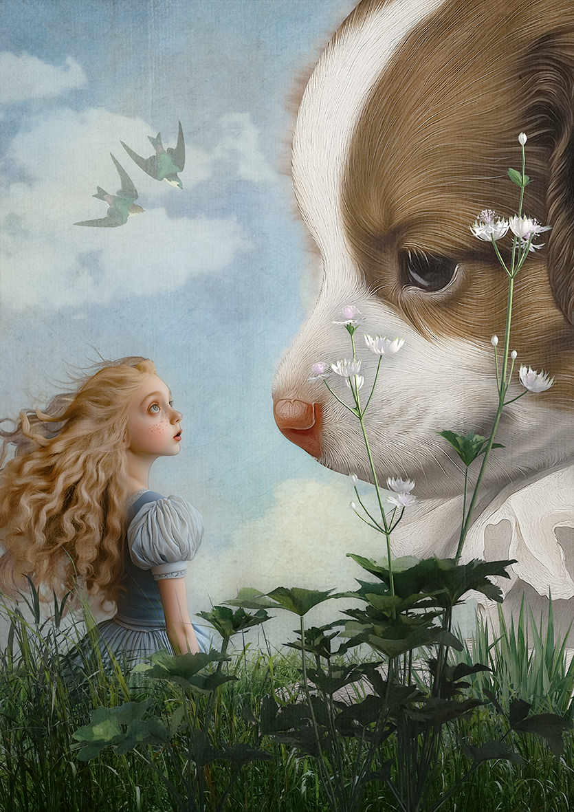 An enormous puppy was looking down at her with large round eyes, and feebly stretching out one paw, trying to touch her."